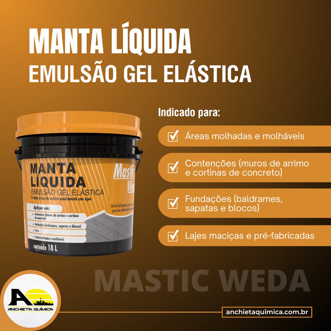 A Manta Líquida é um gel impermeabilizante à base de asfalto emulsionado com água e resina acrílica, desenvolvido para vedação e proteção contra infiltrações. Após a secagem, forma uma película elástica e flexível, ideal para áreas que precisam de impermeabilização eficiente e duradoura.